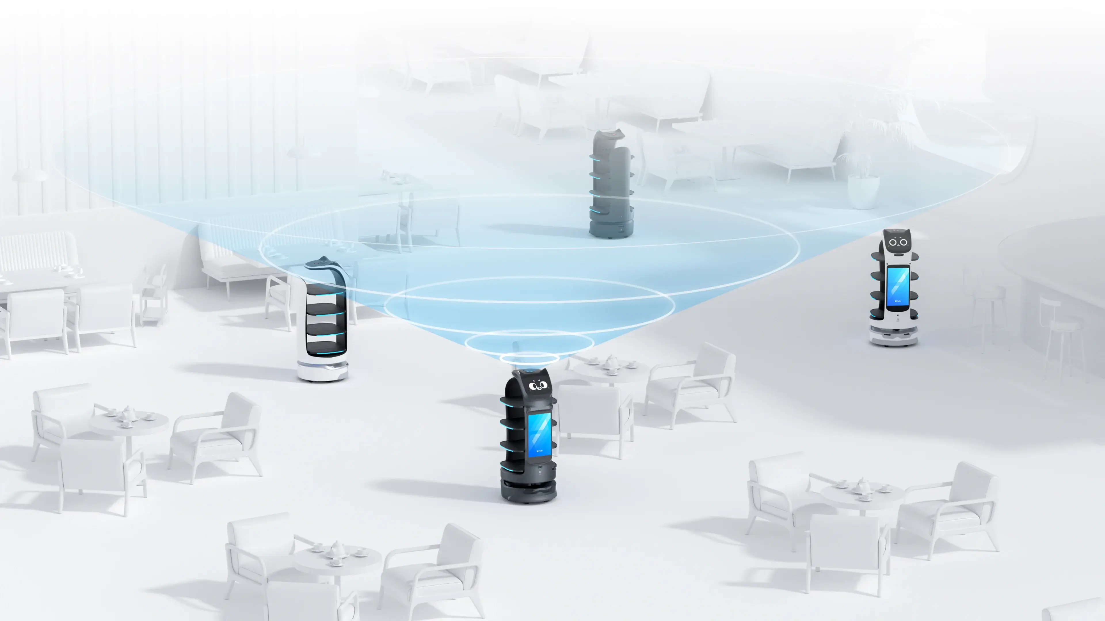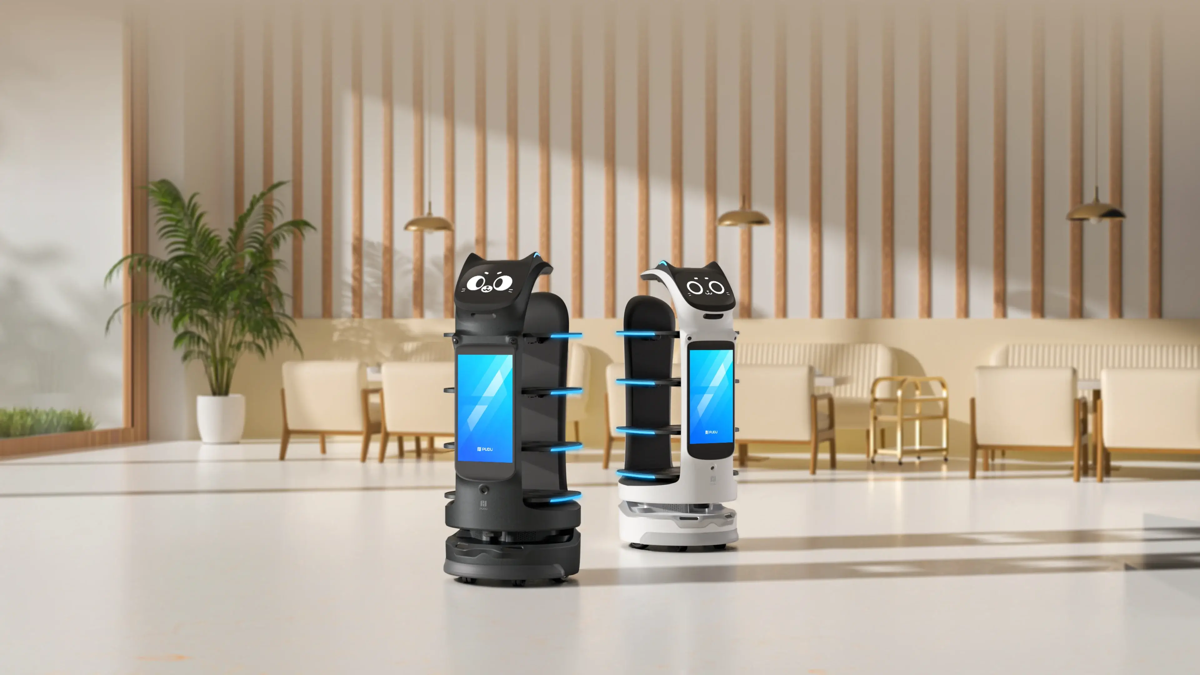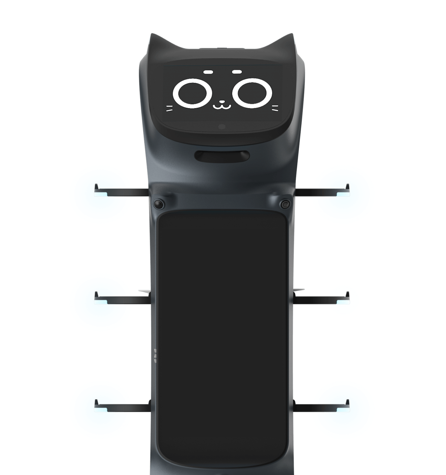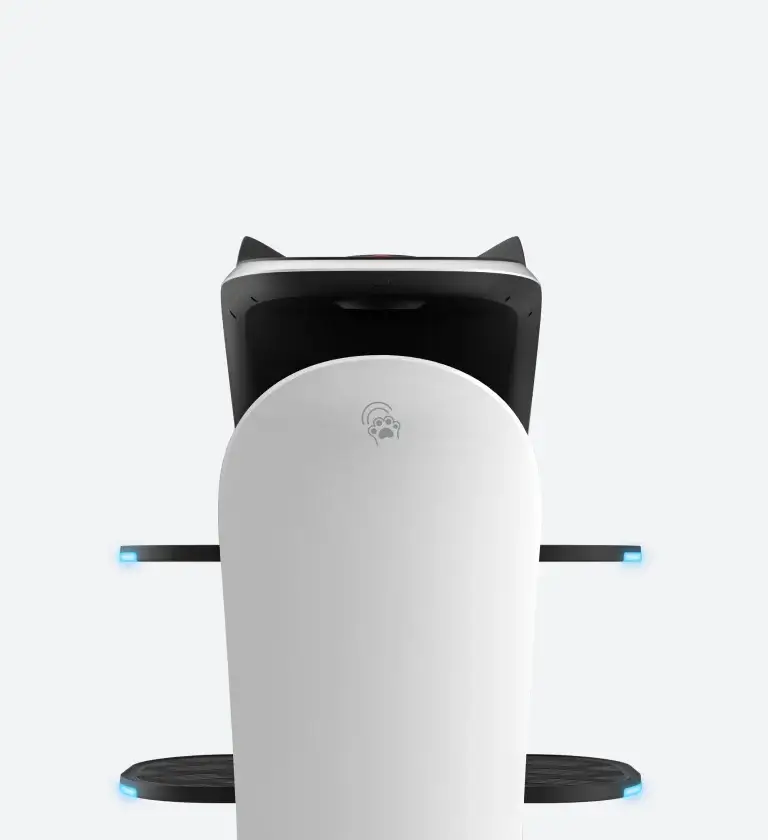 Bellabot Pro,一款设计灵感来源于猫的服务机器人,其独特的猫耳朵设计语言增加了趣味性和亲和力,将前置摄像头与猫耳朵设计相结合,延续仿生设计产品形态的功能意义和形态美学,为用户呈现亲和自然的人机交互体验。通过切面设计将广告屏融入机身,有效降低了光线在屏幕罩上的反射损耗,显著提升了屏幕的可读性,展示各种商业信息。