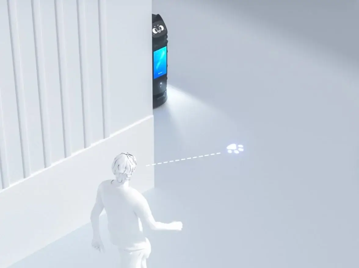 机器具备自主安全意识,在临近路口时会地面投影图案提醒行人,保障盲区安全